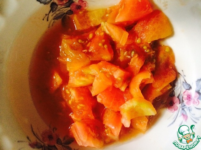 С помидоров убираем шкурку. Нарезаем крупными кусочками.