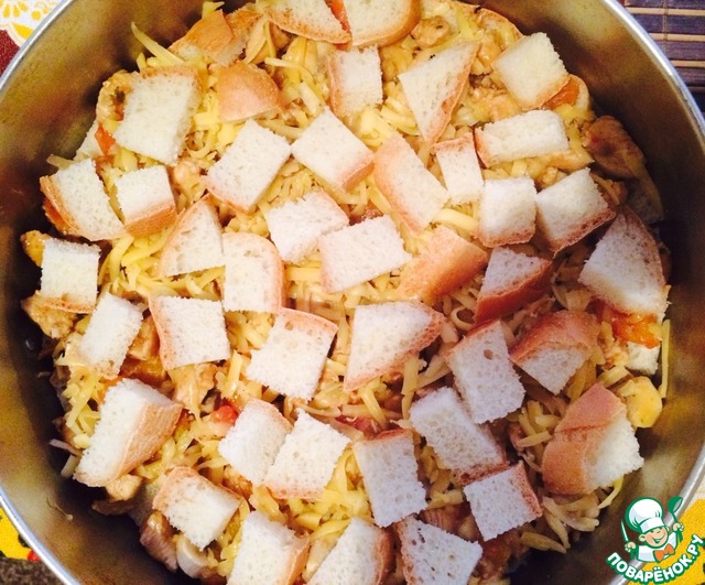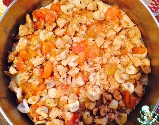 Теперь пришло время укладывать слои пирога! На кубики батона, которые мы уже давно выложили, кладем две трети начинки из грибов, курицы и помидоров.