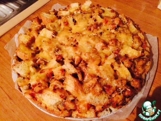 Пирог очень вкусный, ароматный, сочный и с хрустящими бортиками. А главное - все необыкновенно просто и быстро, справится даже ребенок! Не надо возиться с тестом, что-то раскатывать, переживать, пропечется ли корж.. У нас будет пирог на основе хлеба с классической любимой начинкой - курица, грибы и сыр. К тому же, это очень вкусный и удачный способ утилизировать залежавшийся хлеб.