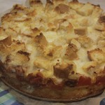 Все это дело заливаем яично-сливочной смесью и отправляем в разогретую до 200 градусов духовку минут на 20-25 (ориентируйтесь по своей). За это время заливка должна схватиться, а кусочки батона сверху и по бокам обрести приятную хрустинку. -