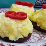 Итак, кладем кусочек помидора, затем примерно 2 чайные ложки сырковой массы, немного утрамбовываем. -