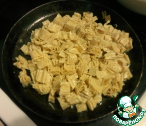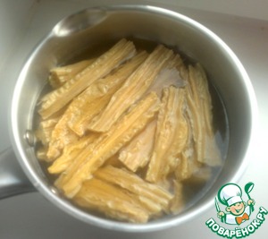 6 палочек сухой соевой спаржи фучжу ломаем пополам и кладем в грибной бульон.
