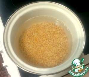 Горох хорошо промываем, заливаем холодной водой, чтобы она покрывала горох на два пальца.