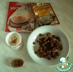 Первым делом замочим шафран в 1 ст. л. молока и промоем изюм.