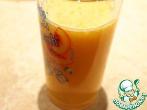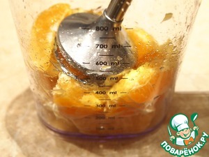 Тем временем апельсины помыть, почистить. С помощью погружного блендера (у меня специальная насадка для отжима сока) измельчить апельсины.