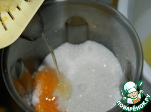 • Остальной сок соединить с творогом, 2-мя желтками и сахаром. Взбить в блендере до однородности.