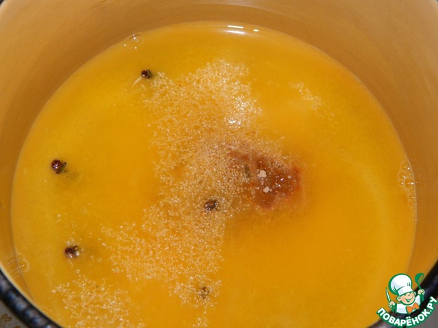 Вылить его в кастрюльку, добавить имбирь, карри, чеснок, гвоздику и сахар. Довести до кипения и проварить минут 10. Соус немного начнет густеть.