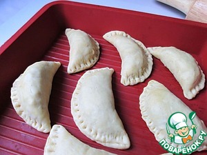 Тонко раскатываем каждый кружок, в центр кладем примерно 1 ч. л. начинки с горкой, сворачиваем заготовку в форму полумесяца и тщательно защепляем края.
