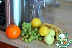 Фрукты помыть. Все кроме банана пропустить через соковыжималку. Быстро и тихо моя соковыжималка приготовила 300 мл сока.