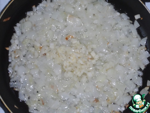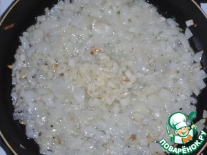 Обжарить лук в сковороде до прозрачности. Добавить чеснок к луку.