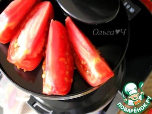 Помидоры нарезать кусочками, выжать сок с помощью шнековой соковыжималки. Сок получился густой, с мякостью, около 250 мл. Инновационная технология приготовления сока на низких оборотах, бережно выжимает сок, автоматически отделяя даже такие мелкие косточки как у помидора, и сохраняет до 85% витаминов, минералов и микроэлементов.