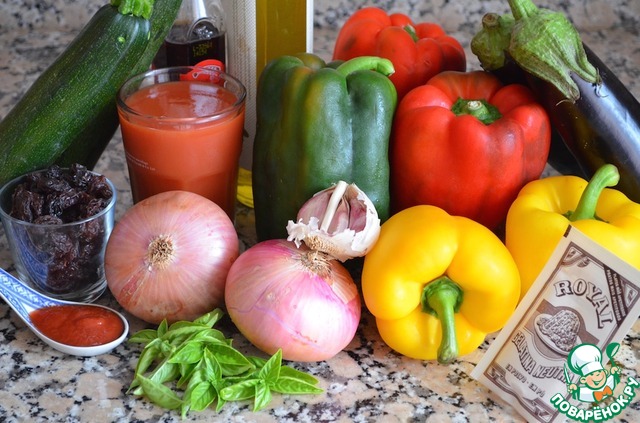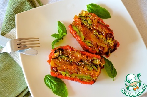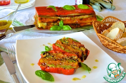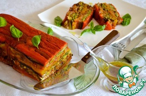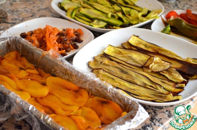 • 8. Продолжать чередовать овощные слои, посыпая их солью и перцем и заливая соком. Завершить слоем красного перца. Вылить оставшийся сок сверху. Хорошенько стукнуть формой о рабочую поверхность, чтобы сок прошёл между слоями. Закрыть плёнкой и убрать в холодильник на ночь.