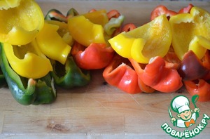 • 1. Перцы разрезать на четвертины, удалить семечки и белую прожилку. Выложить на решетку и запечь в духовке, желательно, в режиме гриль, пока не потемнеет кожица. Убрать готовые перцы в миску, накрыть тарелкой и дать остыть.