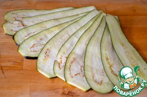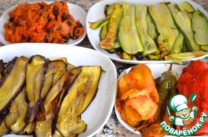 • 2. Нарезать баклажаны и цуккини вдоль на пласты средней толщины. Выложить на отдельные противни, смазанные оливковым маслом. Кисточкой смазать ломтики овощей оливковым маслом. Запекать до готовности примерно 10 минут.