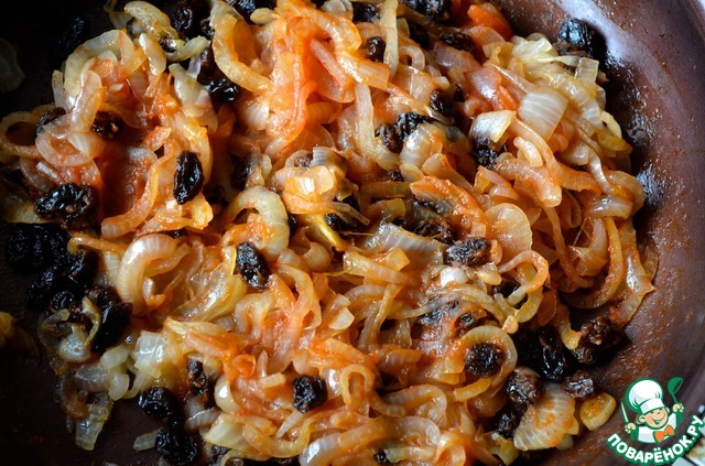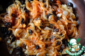 • 3. Порезать лук полукольцами, потушить в оливковом масле пару минут. Потом добавить изюм, томатную пасту, винный уксус, посолить и поперчить. Готовить на небольшом огне 5-7 минут, до получения сиропообразной массы. Дать остыть.