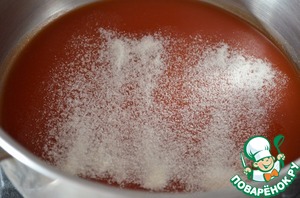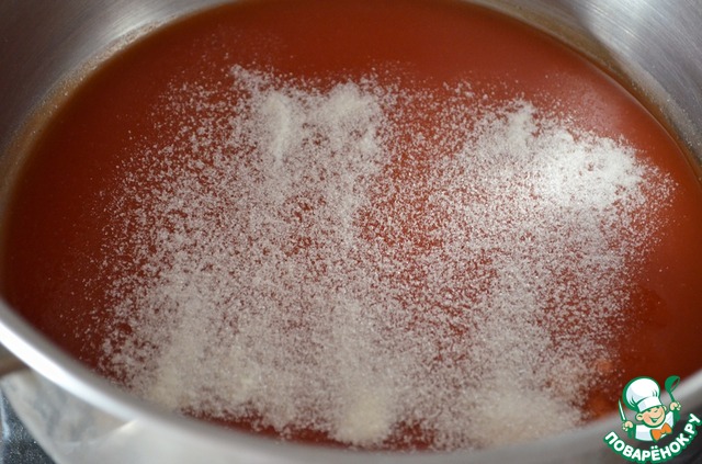 • 5. Вылить томатный сок в кастрюлю, сверху всыпать желатин и разогреть все на низком огне, постоянно помешивая, до растворения желатина.