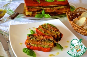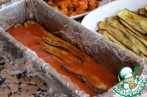 • 6. Выложить слой красного перца на дно террина, посыпать солью и перцем. Сверху положить слой баклажана, тоже приправить и залить все соком с желатином.