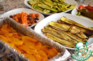 • 7. Добавить слой цуккини и желтого перца, тоже посыпая солью и перцем, залить соком. Выложить слой лука с изюмом, слой желтого перца и залить соком.