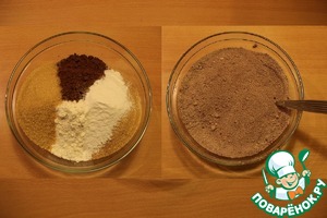 • Соединяем сухие ингредиенты: мука+разрыхлитель+са хар+какао