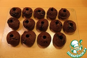 • Осталось самое простое. Разогреть на водяной бане шоколад. У меня силиконoвая кисточка, размазываем шоколад на шапочках и украшаем коктейльными вишнями.