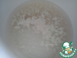 • Сначала нужно вылить стакан тёплой воды (внимание! вода должна быть не горячее 40 градусов!) в большую миску, где мы будет замешивать тесто. Затем нужно добавить в воду сахар и дрожжи. Не размешивайте их. Теперь ждём 10-15 минут, пока на воде не поднимется шапочка, которую я постаралась показать на фото.