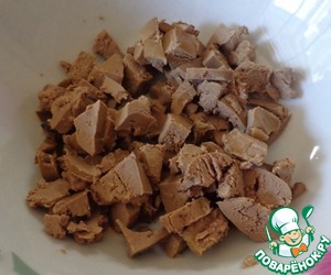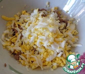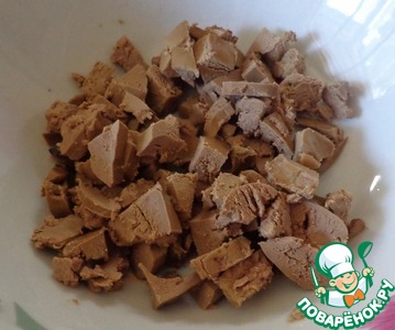 Куриную печень отварить до готовности в подсоленной воде. Порезать на небольшие кусочки.