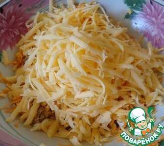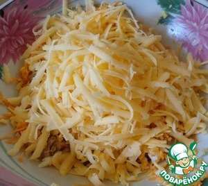 Сырую морковь натереть на мелкой терке и добавить к основной массе. Сыр натереть на крупной терке, добавить также к общей массе и перемешать.