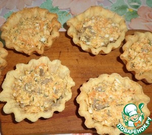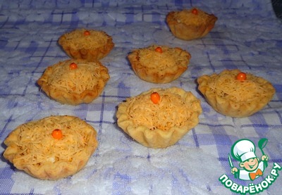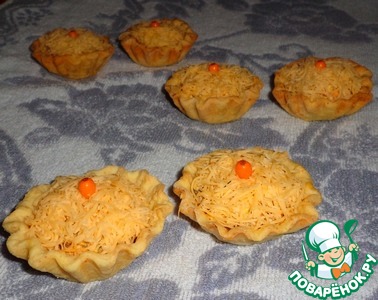Закусочные тарталетки из нежного творожного теста с сытной и сочной печеночно-сырной начинкой. Тарталетки можно приготовить просто к обеду, а также подать к праздничному столу.