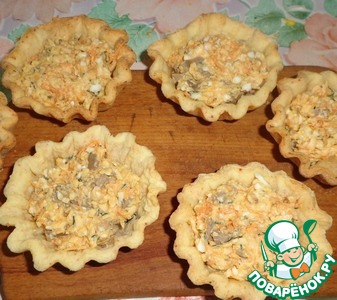 Добавляем сметану, хорошо перемешиваем и заполняем наши тарталетки.