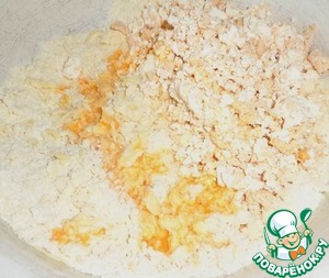 Приготовим творожное тесто с добавлением свежевыжатого облепихового сока. Итак, необходимо растереть в крошку муку с маслом. Затем добавить творог и сок. Замесить тесто.