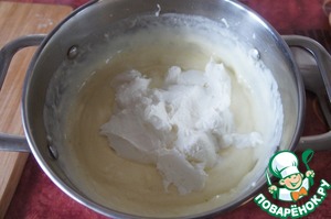 Снять с огня, остудить, добавить ванильный сахар и творожно-сливочный сыр.