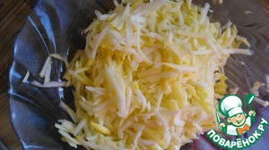 Пока тесто стоит, чистим и трем кабачок на крупной терке. Трем или мелко режем чеснок, и затем все перемешиваем с тестом.