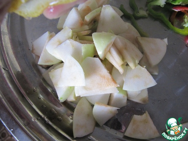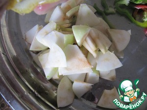 Перец и листья салата нарежьте соломкой, брынзу-кубиками. Яблоки нарежьте ломтиками