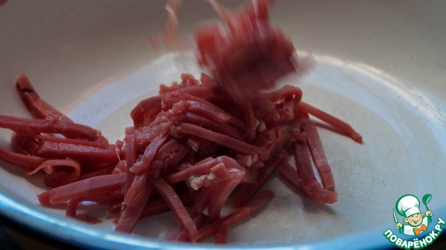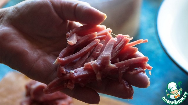 Нарезаем все мясо, максимально стараемся делать полосочки, что не удается порезать то делаем кубиками.