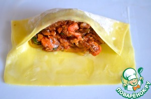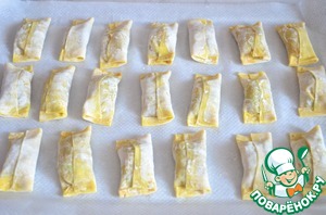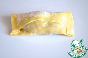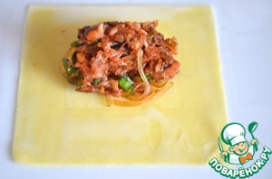 3. Разрезать каждый большой пласт теста на 4 равных квадрата. Накрыть полотенцем, чтобы тесто не высыхало. Взять один маленький квадрат и выложить на него полную чайную ложку начинки ближе к одному краю. Смазать края крахмальной пастой.