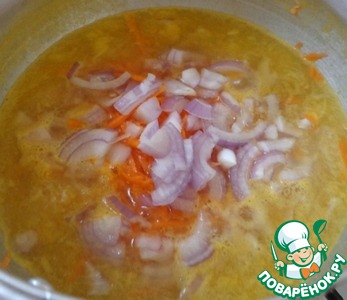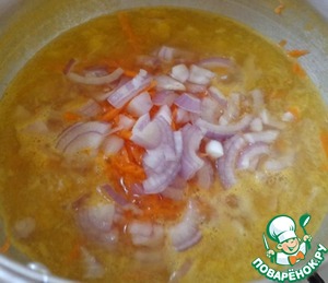 • Затем добавляем морковь натертую на крупной терке и кусочки репчатого лука.