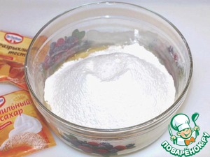 Добавляем небольшими порциями просеянную муку, ванильный сахар, разрыхлитель и вымешиваем тесто как можно дольше.