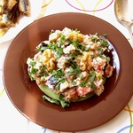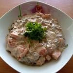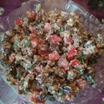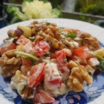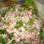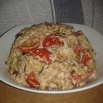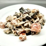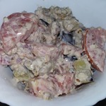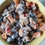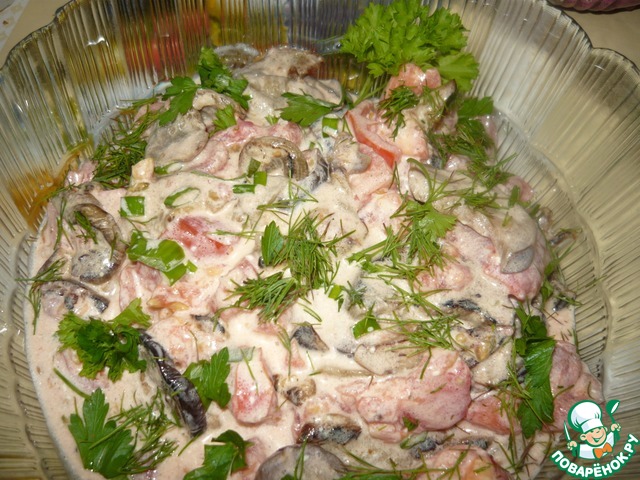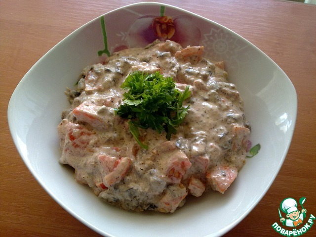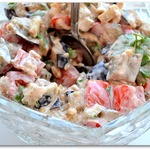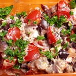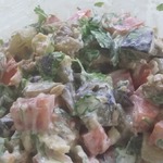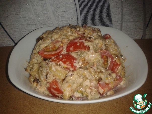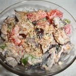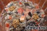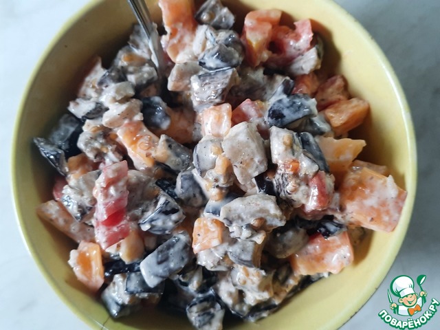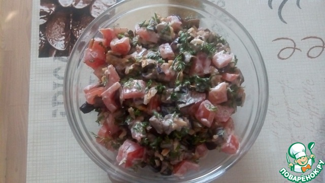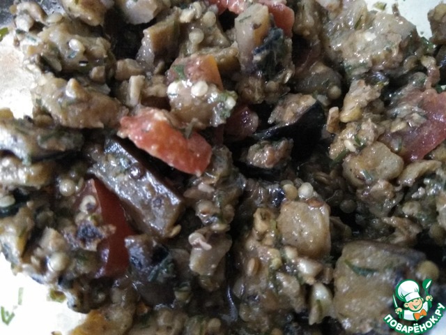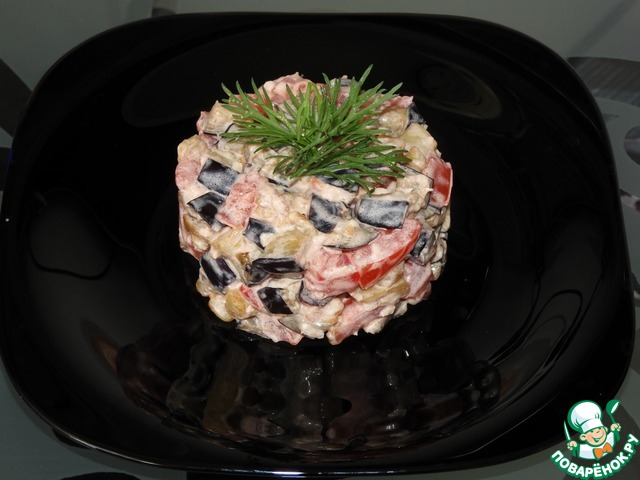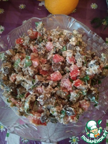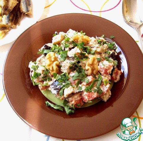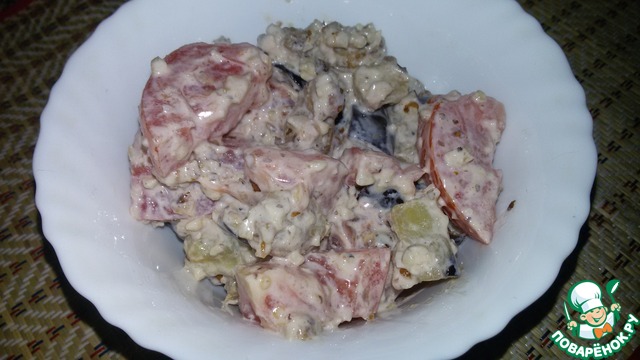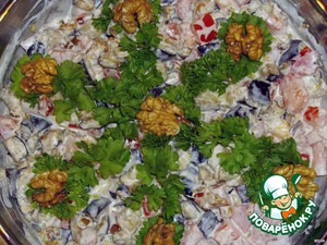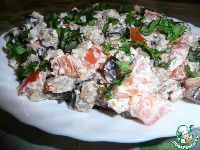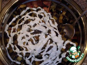 Добавляем остывшие баклажаны, посыпаем перцем, солью. Заправляем майонезом