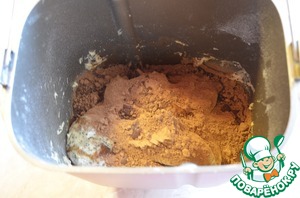 Нужно замесить тесто. Соединить все ингредиенты кроме какао и замесить тесто. Оставить в теплом месте для расстойки на 1-1.5 часа. Так, как я не люблю лишней возни для замеса теста я воспользовалась ХП, режим « основной замес».
