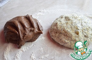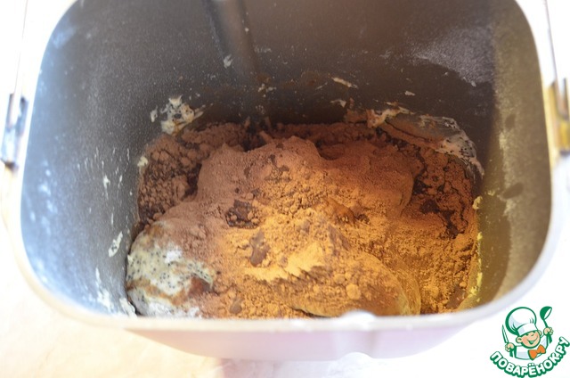 В одну часть теста нужно добавить какао. В этом шаге я попять воспользовалась ХП, замешиала на быстром режиме "пельмени" 10 минут ( программу прерывала, так как за 10 минут какао равномерно замесилось в тесто). Можно сделать это руками.