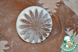 При помощи вырубок вырезать цыеточки. У меня три таких вырубки разного размера, первый у меня цветоцек из темного теста, второй желтый, третий опять из темного.