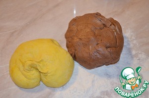 Кусочки которые мы оторвали от теста, подкрашиваем куркумой и какао. Тесто нужно хорошо вымесить, чтоб небыло пробелов.