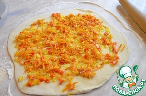 Морковь натереть на крупной терке, лук нарезать кубиками. Кубиками нарезать 1 сладкий перец. Обжарить на сковороде. -
