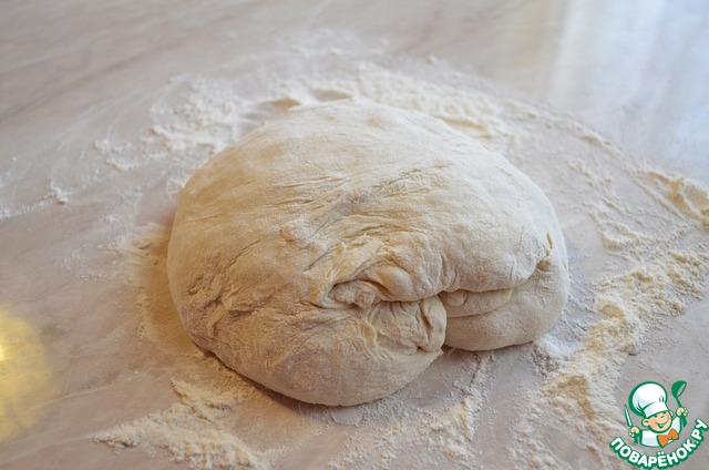 Из муки, сахара, соли дрожжей и воды замесить эластичное тесто. Накрыть тесто полотенцем и оставить для расстойки в теплом месте на 1-1,5 часа.