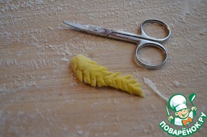 Пока выпекается хлеб, отрываем от теста небольшие кусочки, скручиваем их "колбаской" и при помощи маникюрных ножниц делаем надрезики. Ножницы регулярно обмакиваем в муку, чтоб тесто не прилипало к ним и не портилась форма колоска.