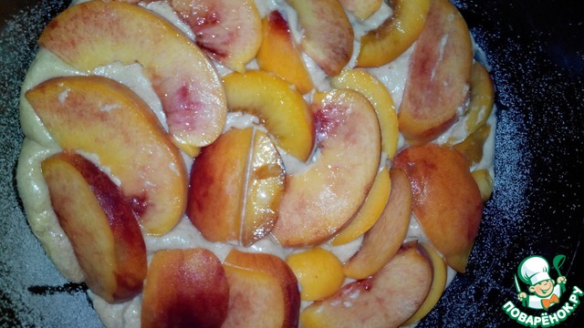 Чашу мультиварки смазываем маслом и посыпаем мукой. Выливаем тесто. Персики режем дольками, выкладываем на тесто и слегка вдавливаем в тесто.