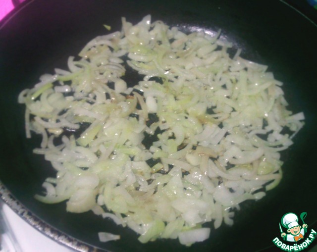 Лук режем четверть-кольцами. Отправляем на разогретую с подсолнечным маслом сковороду.