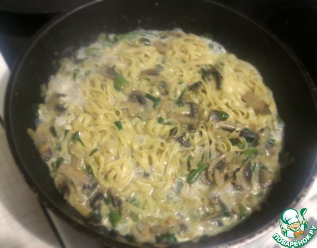 Отдельно в кастрюле варим пасту (у меня - Тальятелле, можно любую) до состояния аль денте..