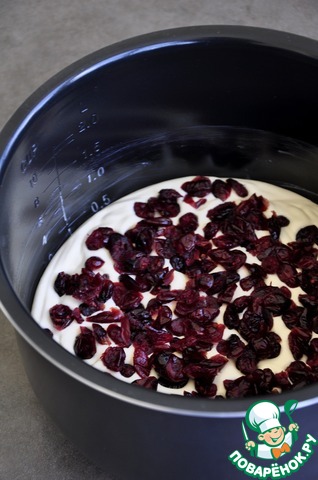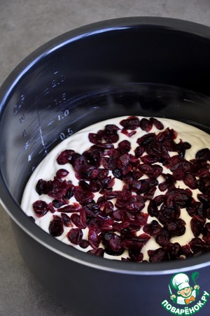 Смазать чашу мультиварки сливочным маслом, вылить половину творожной массы, выложить клюкву.