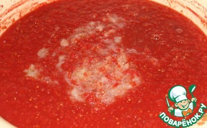 • И ровно через 3 часа добавляем к помидорной массе сахар, соль, лук, чеснок, специи и уксус... НО-с таким количеством уксуса кетчуп получается, ядрёным, поэтому, если Вы хотите чтобы кетчуп получился, нежным, берите половину всего уксуса т. е пол стакана.